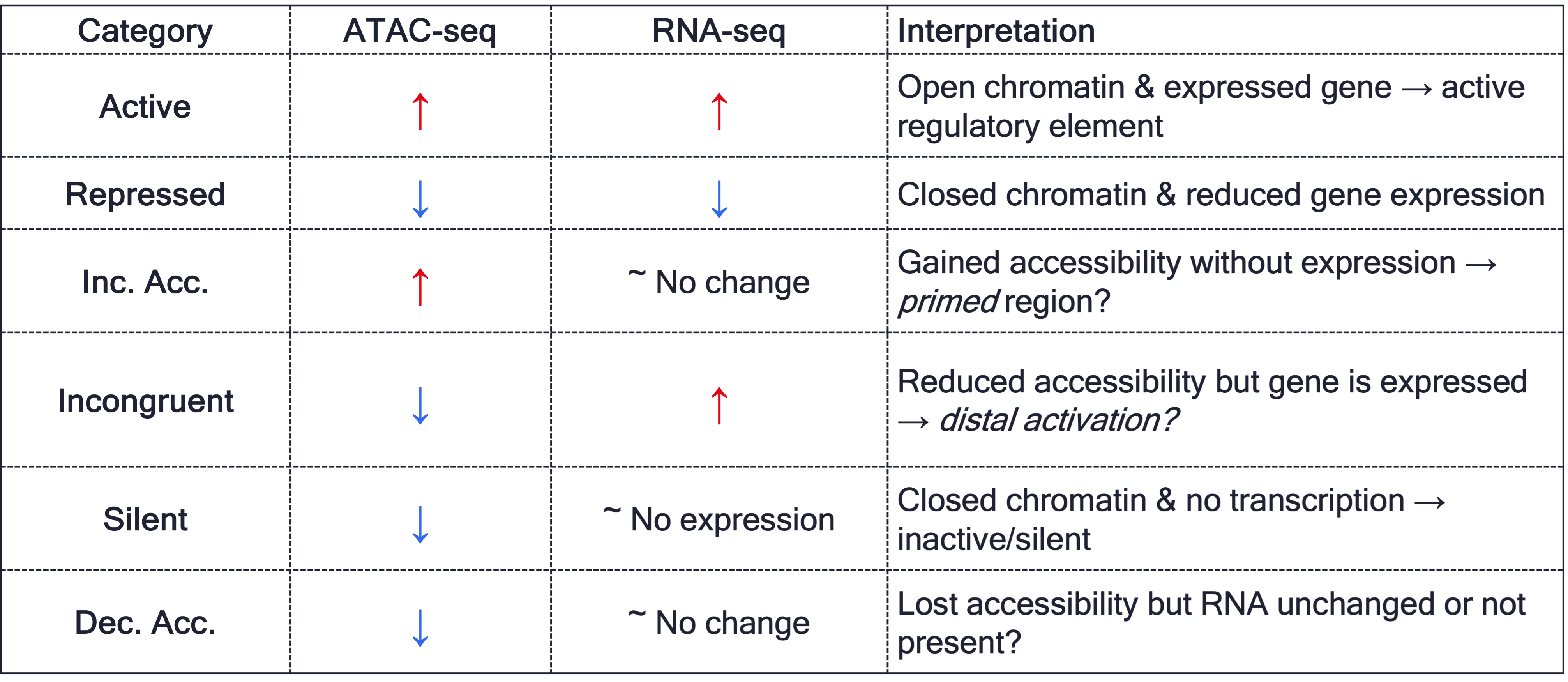 SummarizedExperimentobjects containing ATAC-seq and RNA-seq data. - Understand how to categorize genomic regions based on combined accessibility (ATAC) and expression (RNA) changes.