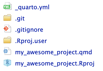_quarto.yml: YML file with project-wide settings.git: Everything required for version control with gitmy_awesome_project.Rproj: R-project based settingsmy_awesome_project.qmd: Where the work is done!qmd fileMarkdown text