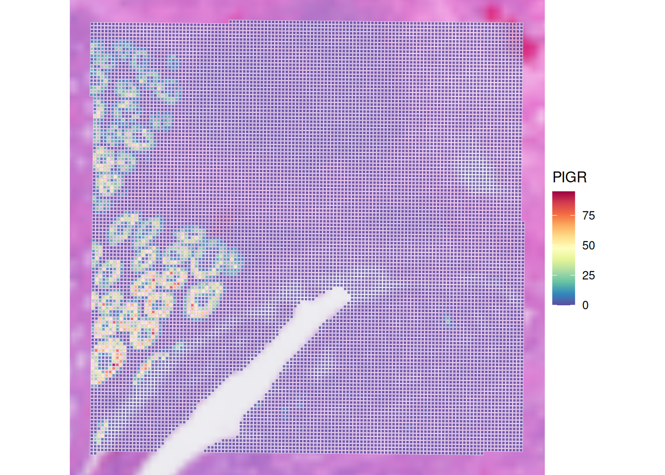 It’s possible to colour spots according to some variable, e.g., the number of read counts for a selected gene (i.e., PIGR):