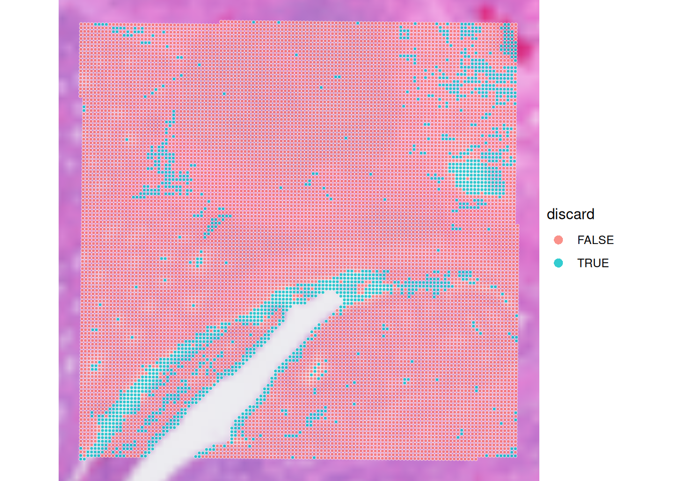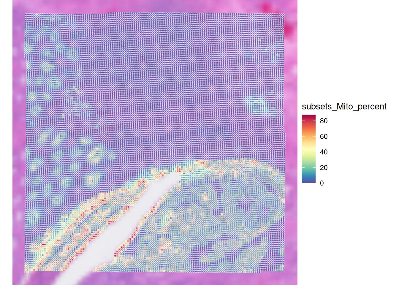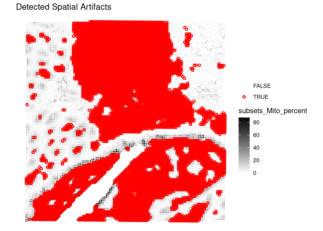 Technical artifacts can arise during tissue preparation, for example tissue dissection can cause mechanical damage, leading to large areas with artificially low biological heterogeneity. These can be detected with the findArtifacts function of the spotSweeper package.