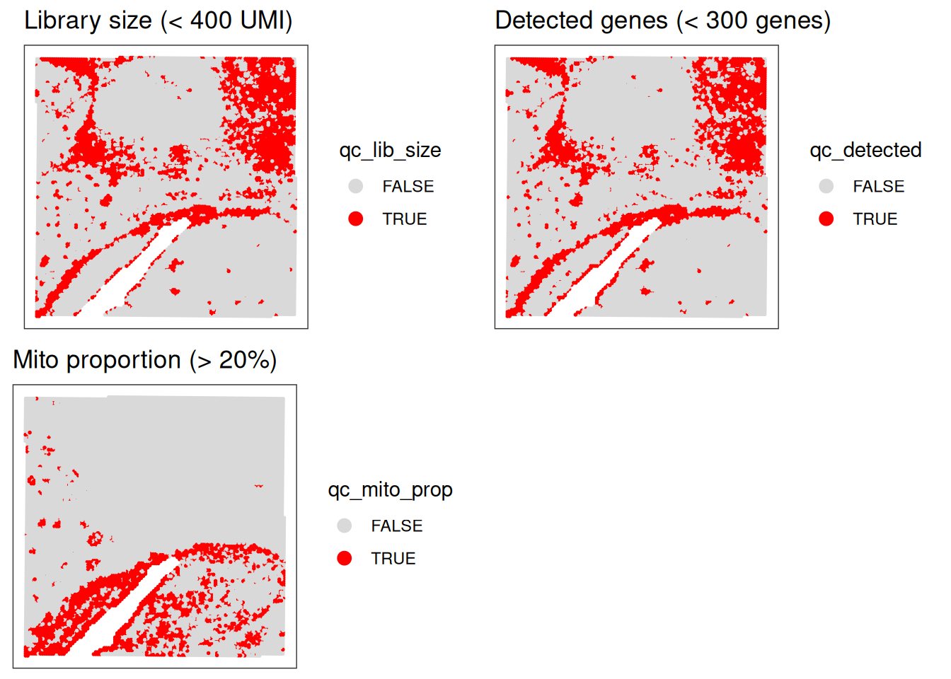 In order to detect low-quality spots and filter them out, QC methods adapted from scRNA-seq analysis can be applied. A simple option is to apply a fixed (upper or lower-bound) threshold to a metric across all spots, and remove the spots that do not pass the filtering criteria applied.