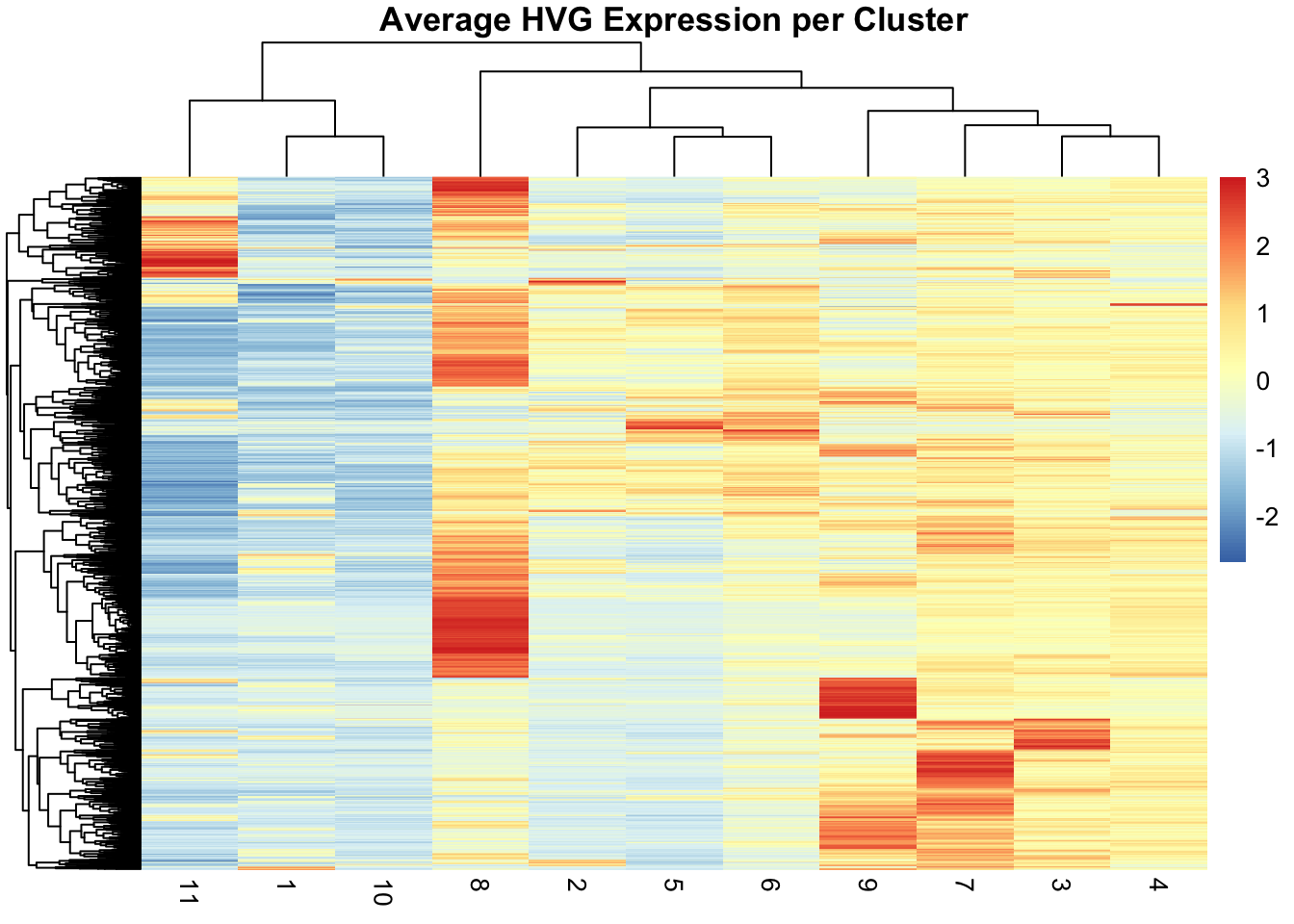 A heatmap of gene expression across the identified clusters can help to visualize the distinct transcriptional profiles that define each cluster. We will plot the expression of the top highly variable genes (HVGs) across the clusters.