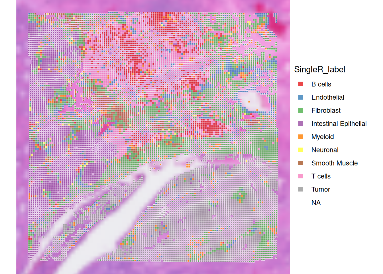 To annotate each spot, we use the SingleR() method, which uses a correlation-based approach comparing test cells (here: spots) to reference samples with known cell-type annotation.