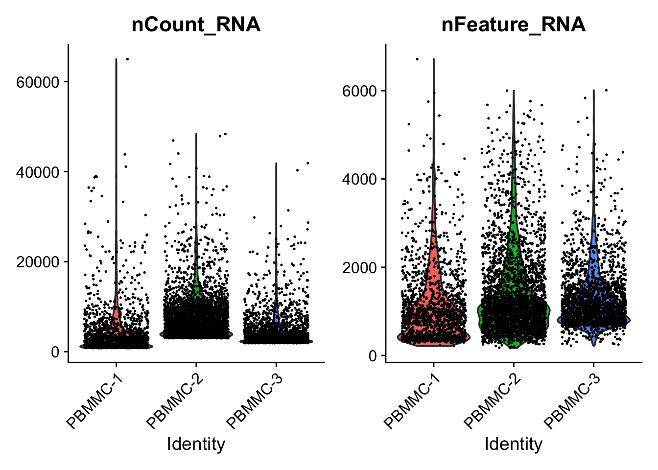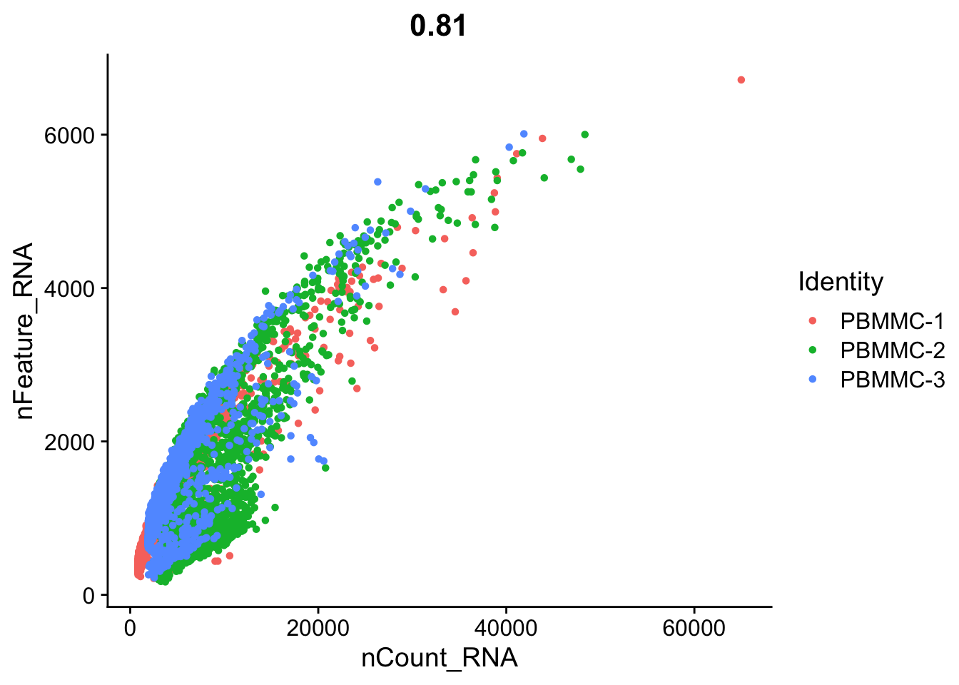 - There are some cells with a very low and very high number of features. These might point to non-informative cells and doublets respectively.