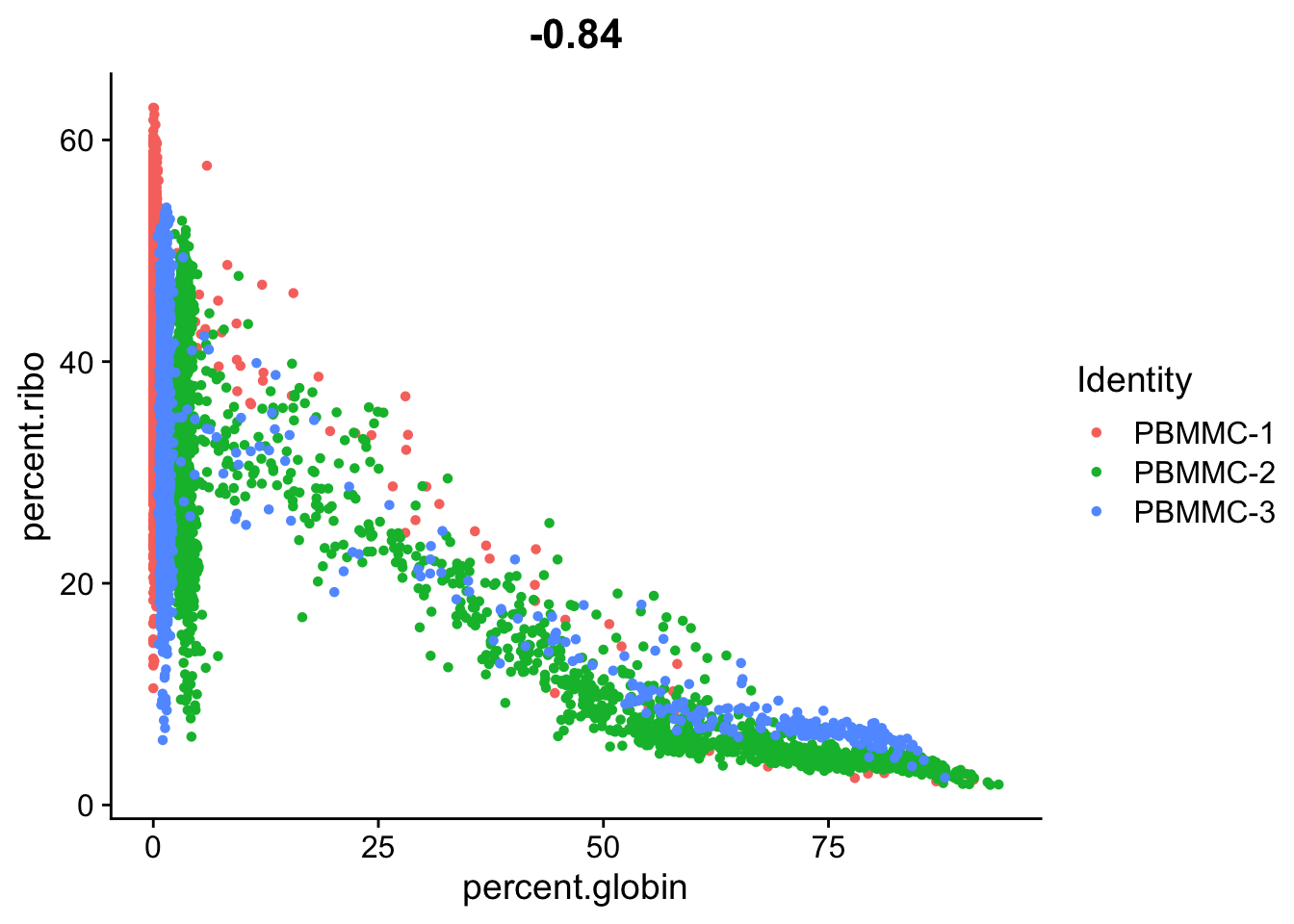 You can see that PBMMC-2 is quite different from the two others, it has a group of cells with very low ribosomal counts and one with very high globin counts. Maybe these two percentages are negatively correlated? Let’s have a look, by plotting the two percentages against each other: