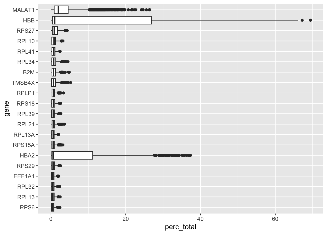 We can also evaluate the relative expression of other genes in our dataset, for example, the ones that are most highly expressed. Some very highly expressed genes might point to a technical cause, and we might consider to remove them. Below you will find a simple function to generate a boxplot of relative counts per gene per cell. Load it into your environment and run it on our seu object: