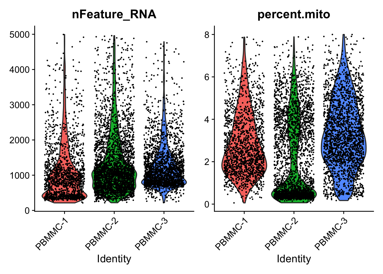 percent.mito < 8)To evaluate this did the trick we can visualize those parameters again in a violin plot: