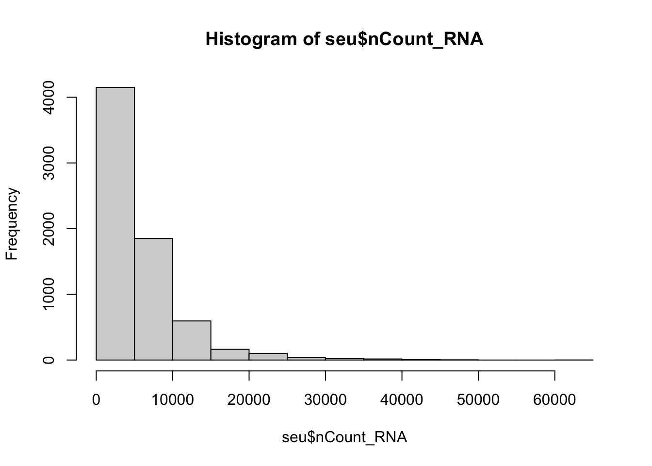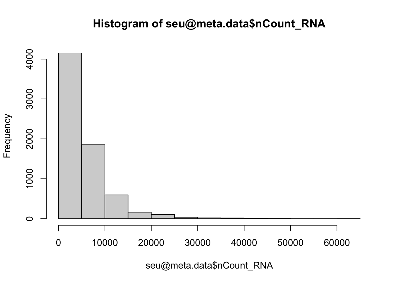 Generate a histogram of the column nCount_RNA at seu@meta.data, with the base function hist.
